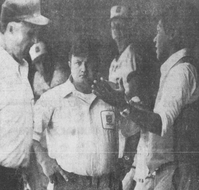 The first National League umpire crew to have their work checked in real-time was that of Ed Sudol, Bruce Froemming, Terry Tata, and Dick Stello. From how the series played out, it is clear that some of these men, particularly Froemming and Sudol, had deep, deep misgivings about in-park instant replay, but nothing Dave Lane chose to put up on the Video Matrix during the first game brought a protest from the umpires. Maybe they just had a really good night. The Braves won that game, 4-3, and everybody but their opponent, the Houston Astros, called that a good start.