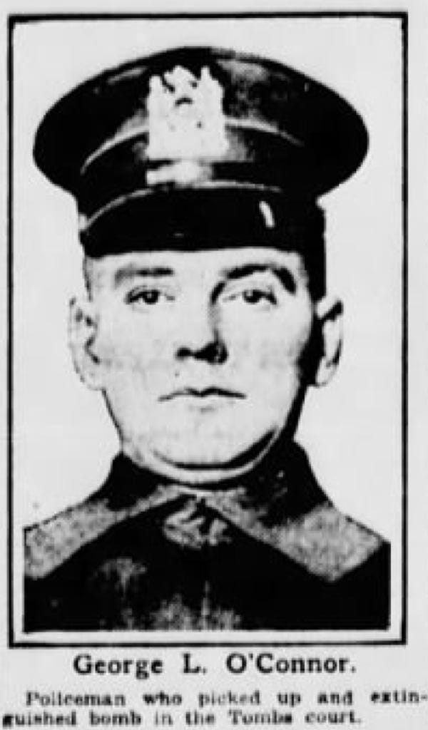 Waiting to process a prisoner, NYPD Patrolmen George O’Connor noticed smoke coming from under a bench, where he found a package wrapped in newspaper, the fuse “spitting and sizzling, sparks setting the paper on fire.” O’Connor tried blowing the fuse out, and when that didn’t work he ripped it out completely. Not knowing what was in the package, he grabbed it and ran out of the courtroom.